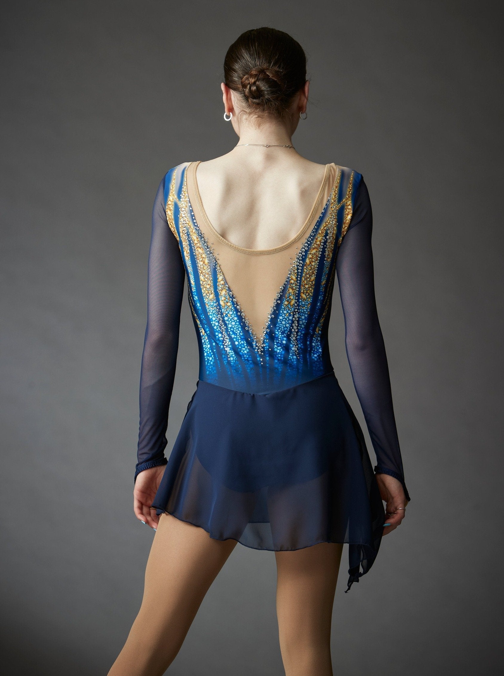 Le corsage est imprimé avec un dégradé de bleu marine et d'or, orné de cristaux, et la jupe oblongue en chiffon est fabriquée par Elite Xpression".