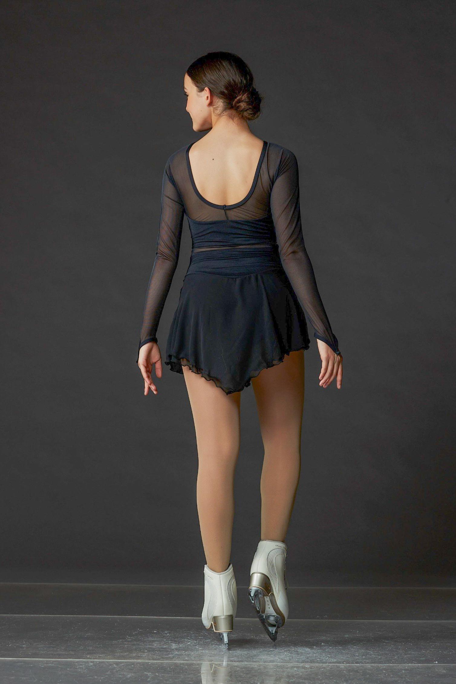 Robe noire avec corsage en filet et manches longues en filet et jupe en mousseline pour le patinage artistique par Elite Xpression