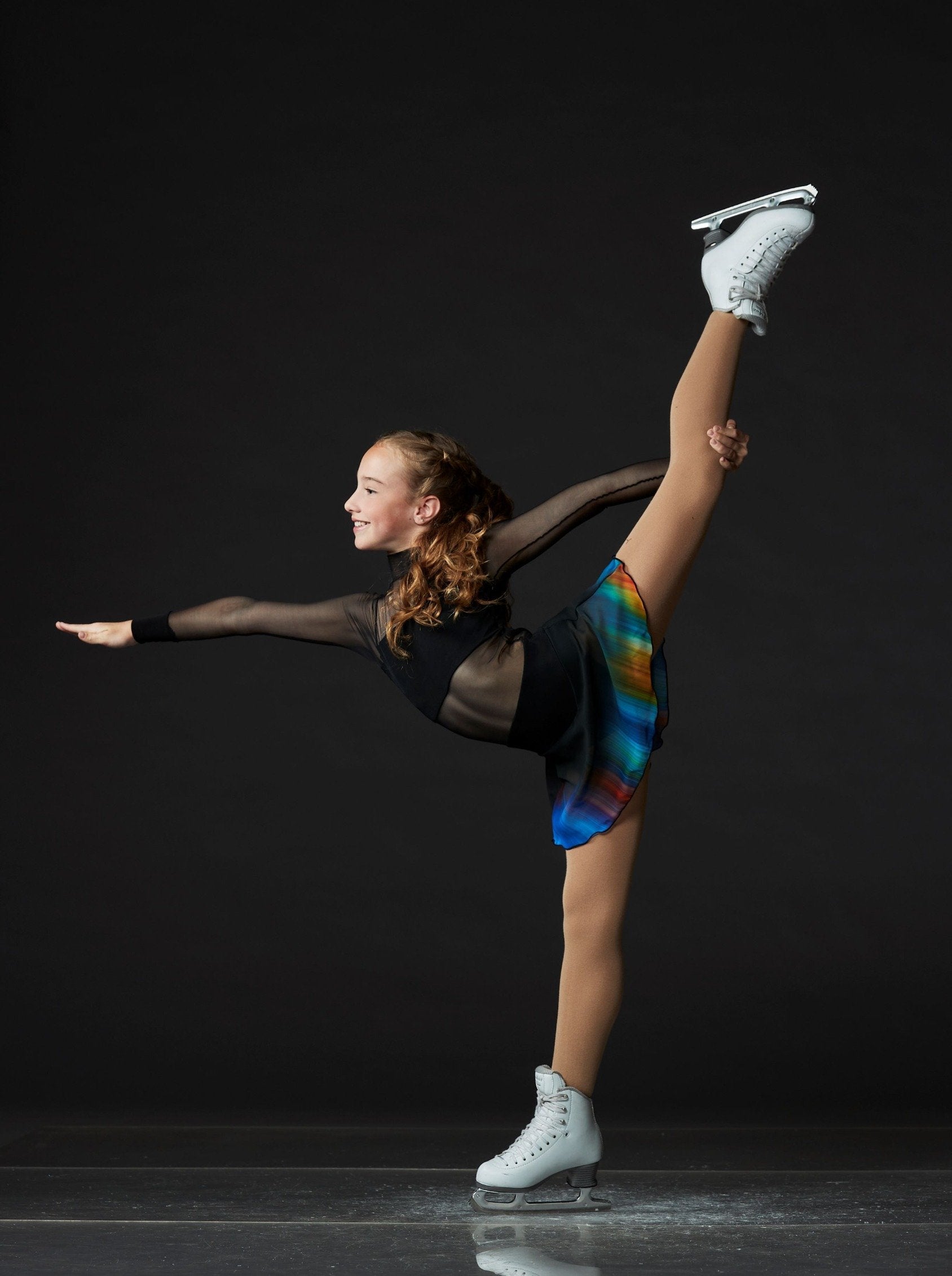 Black figure skating dress by Elite Xpression, featuring a mesh-exposed bodice, sheer mesh long sleeves, and a printed boreal chiffon skirt.