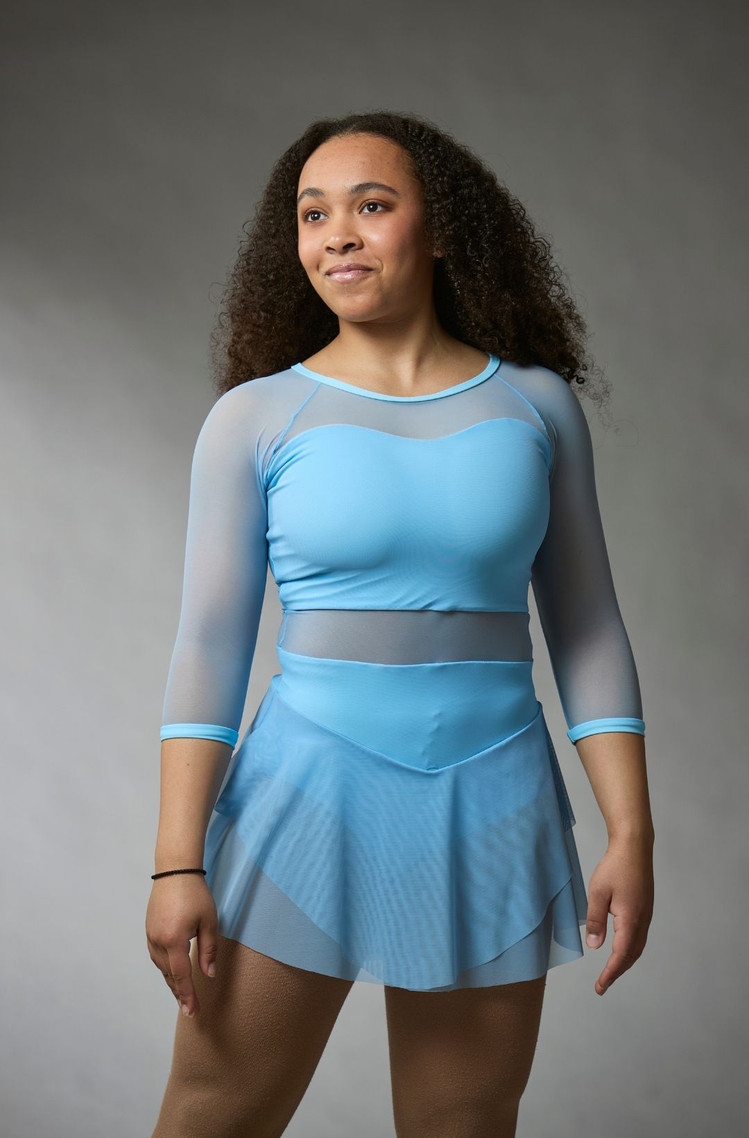 Robe de patinage artistique simple bleu clair en mèche, avec des manches trois quarts et une jupe en mèche à deux épaisseurs. Les bretelles croisées accentuent le dos ouvert, avec un empiècement en mèche au niveau du corsage. De la collection Elite Xpression.