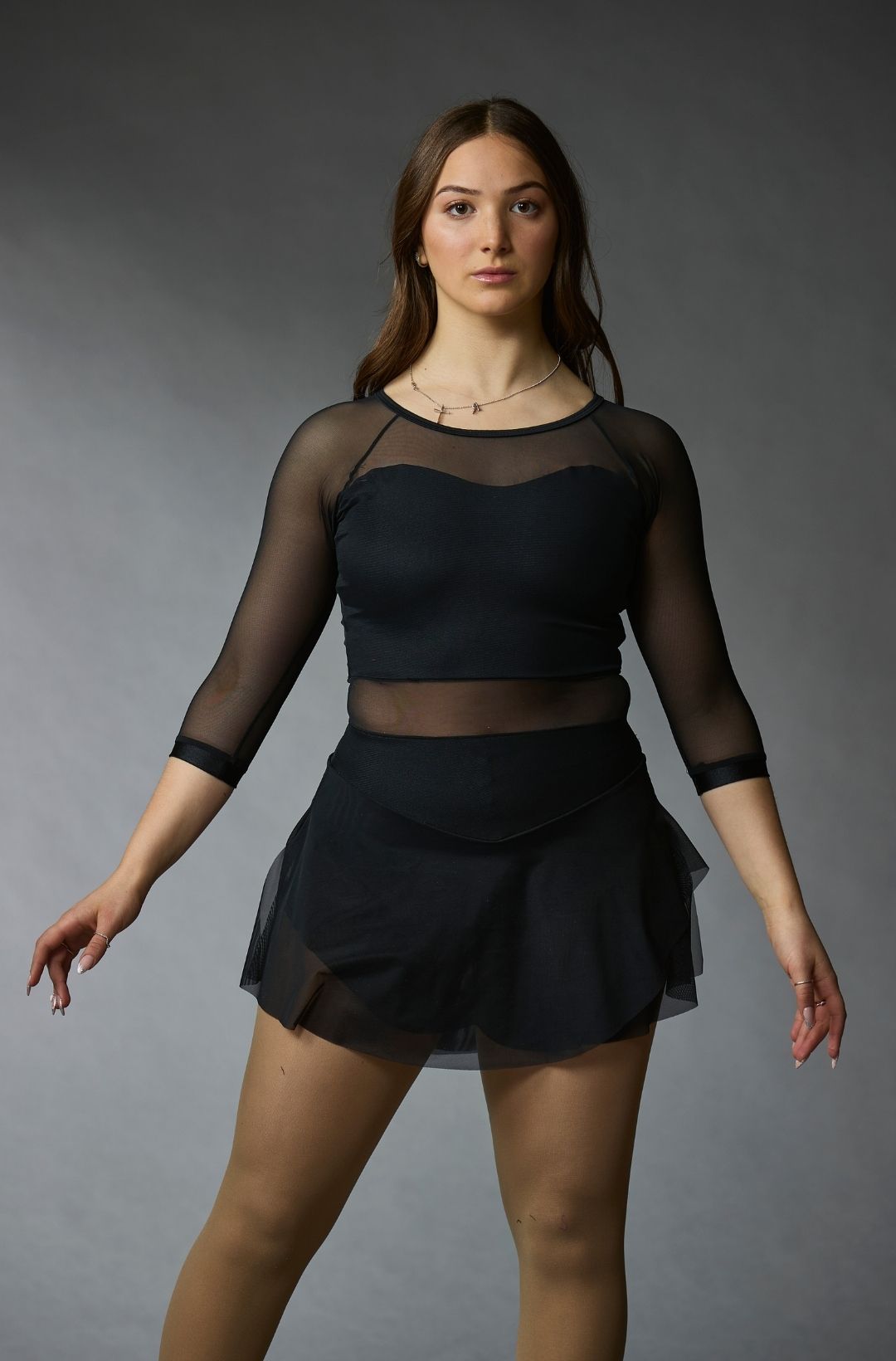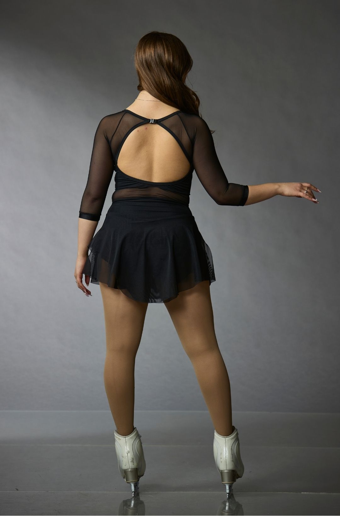 Robe de patinage noire à silhouette simple en maille, avec des manches trois quarts et une jupe en mèche à deux épaisseurs. Dos ouvert, avec un empiècement en mèche au niveau du corsage. De la collection Elite Xpression.