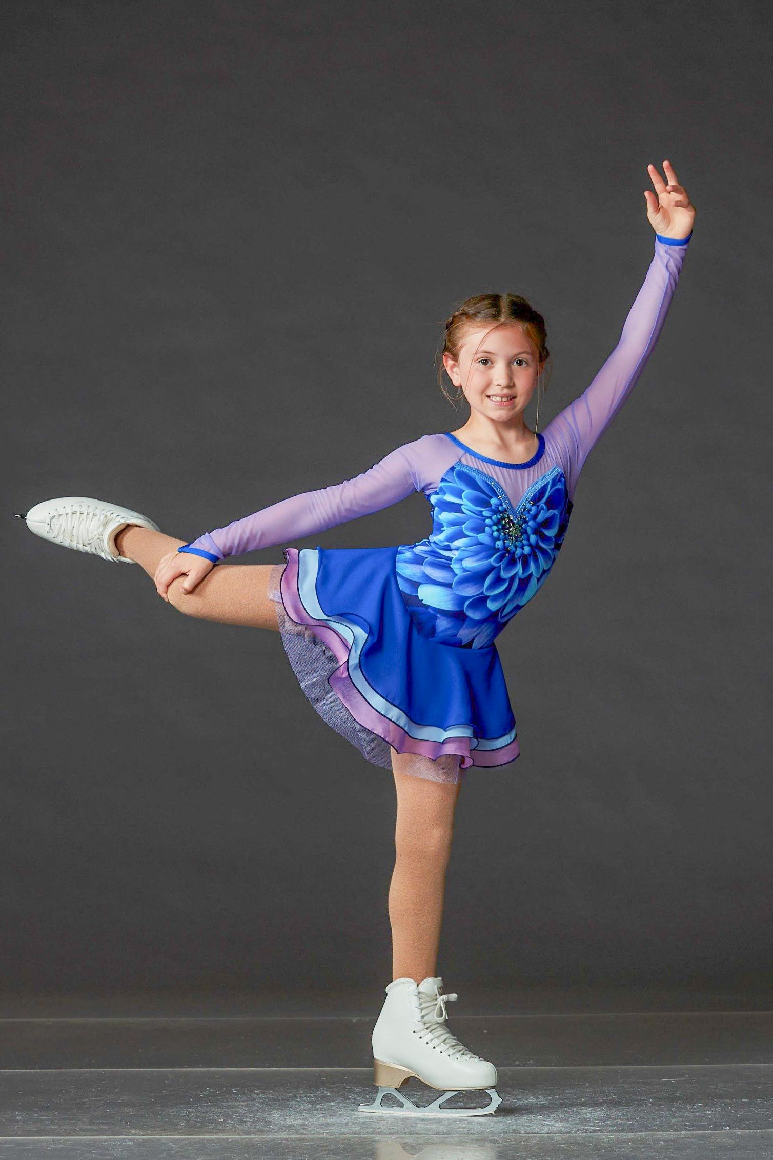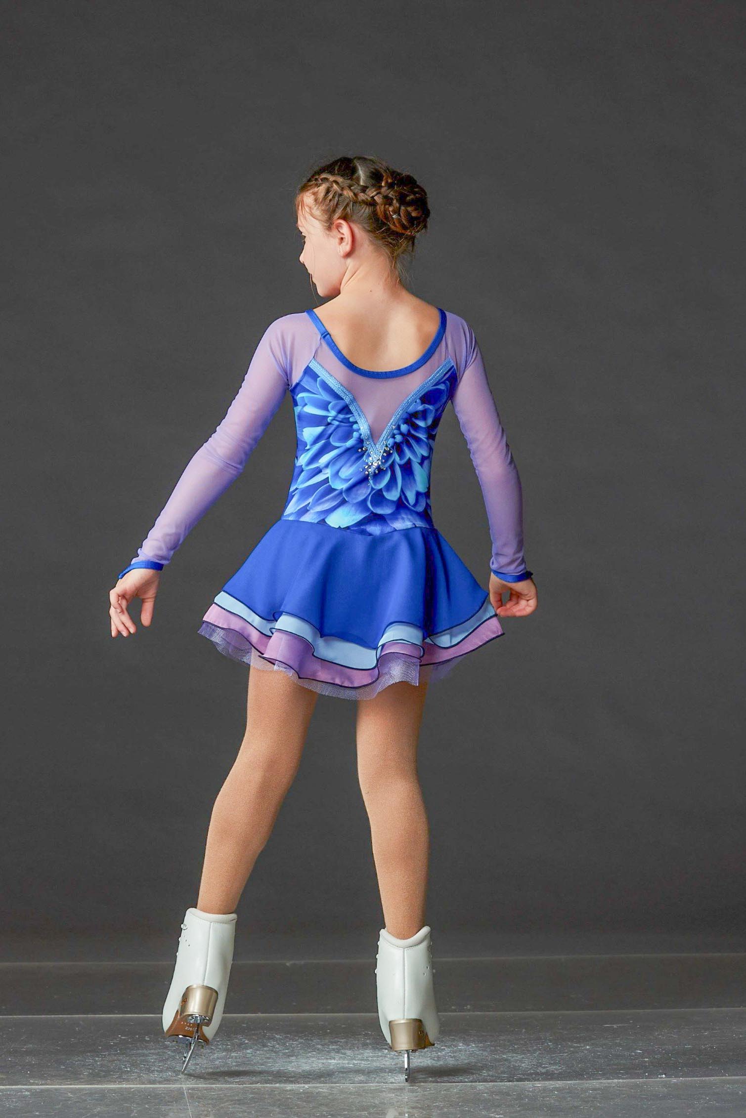 Figure skating dress by Elite Xpression, featuring mesh long sleeves, printed bodice with crystals, and a multi-layered textured skirt.