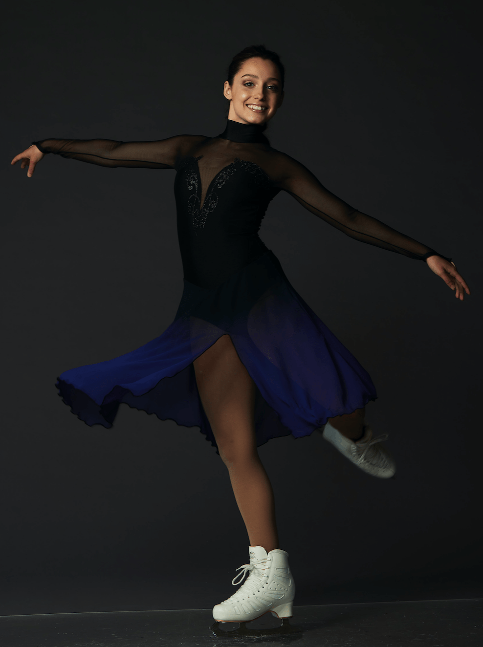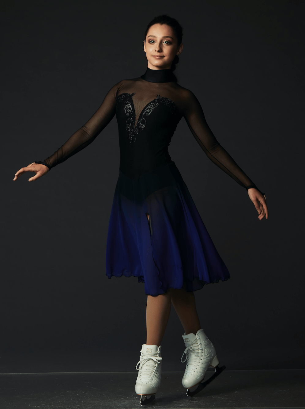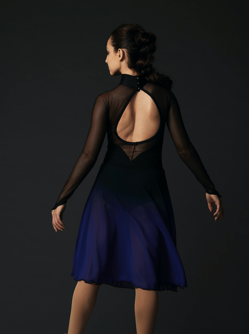 Robe de danse noire et mauve avec manche en mèche noire et jupe en chiffon dégradée mauve de la Collection Elite Xpression.