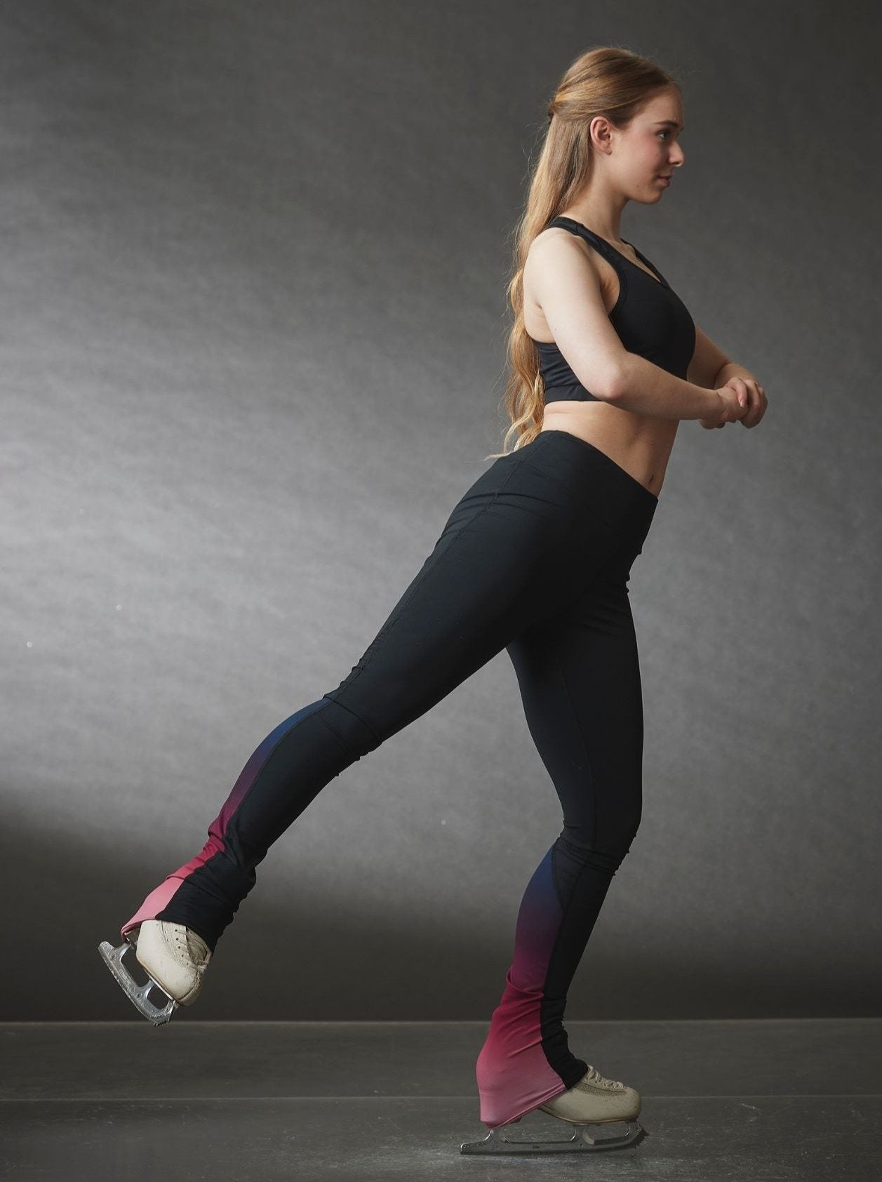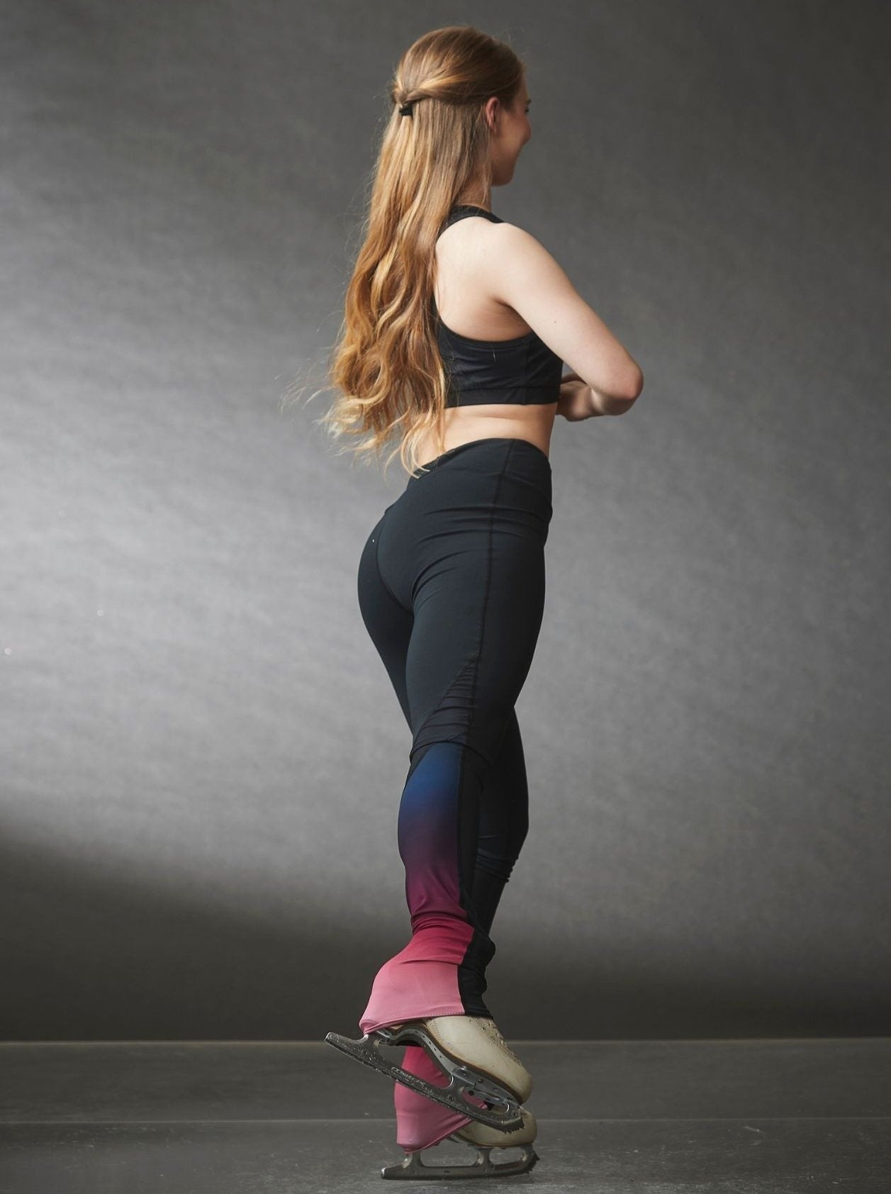 Leggings d'entraînement de patinage artistique en Lycra noir avec une large bande à la taille, un empiècement en filet à l'arrière de la jambe et un ombré d'un rose foncé à un rose clair.