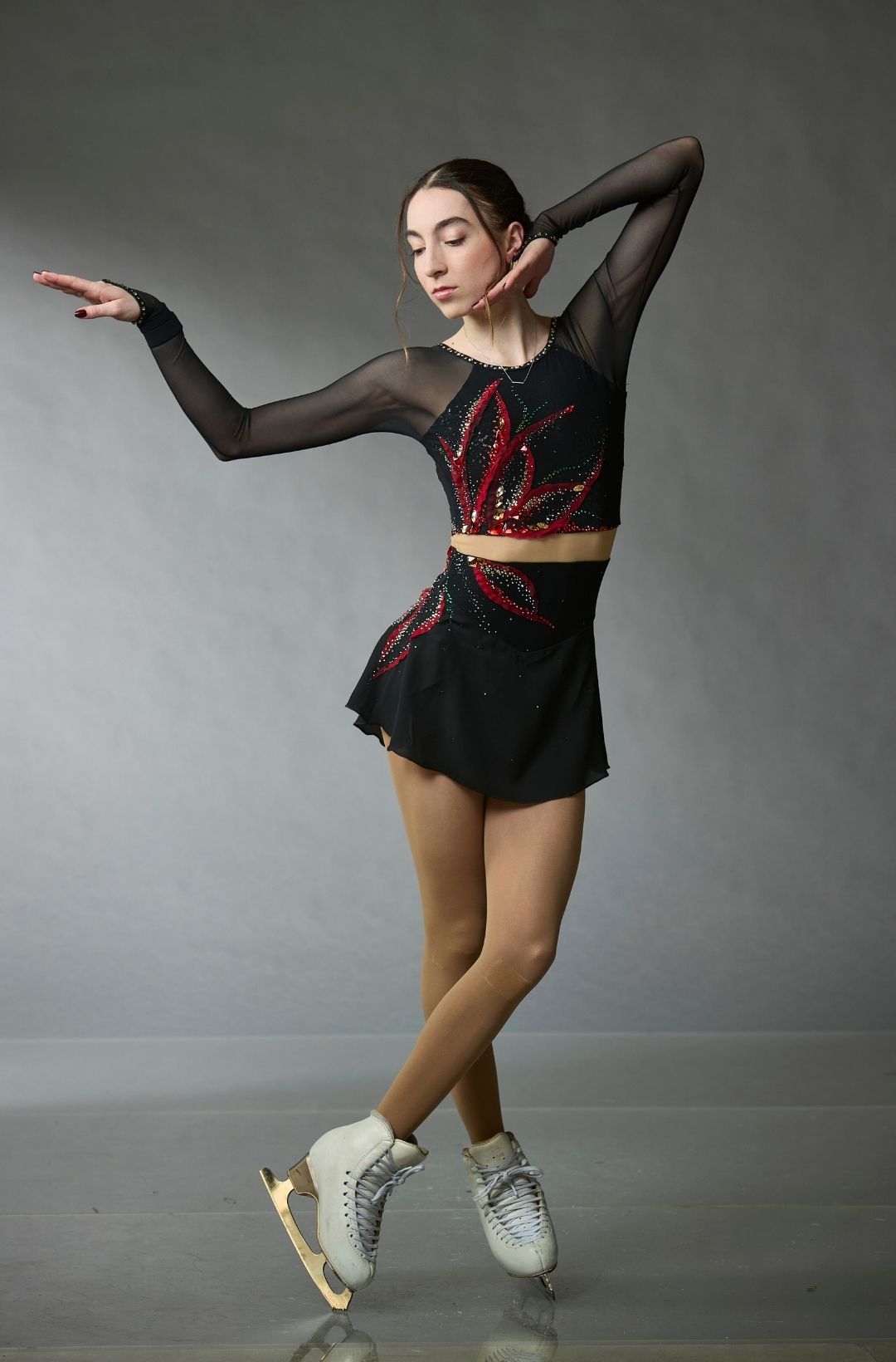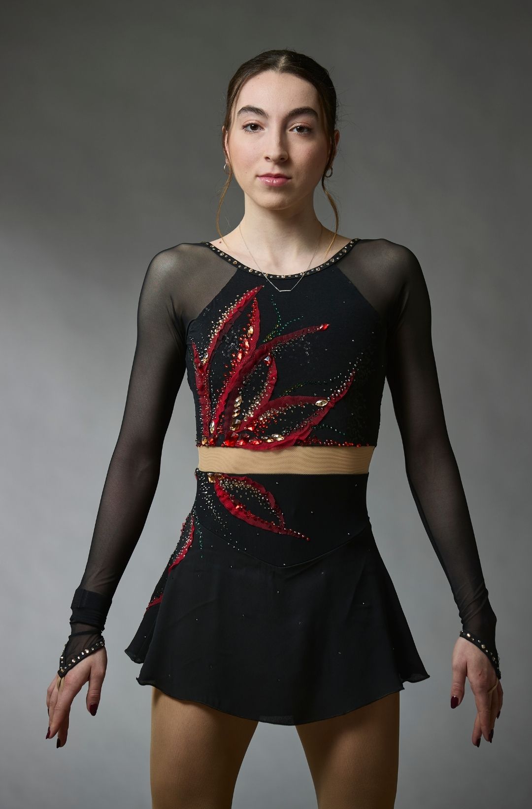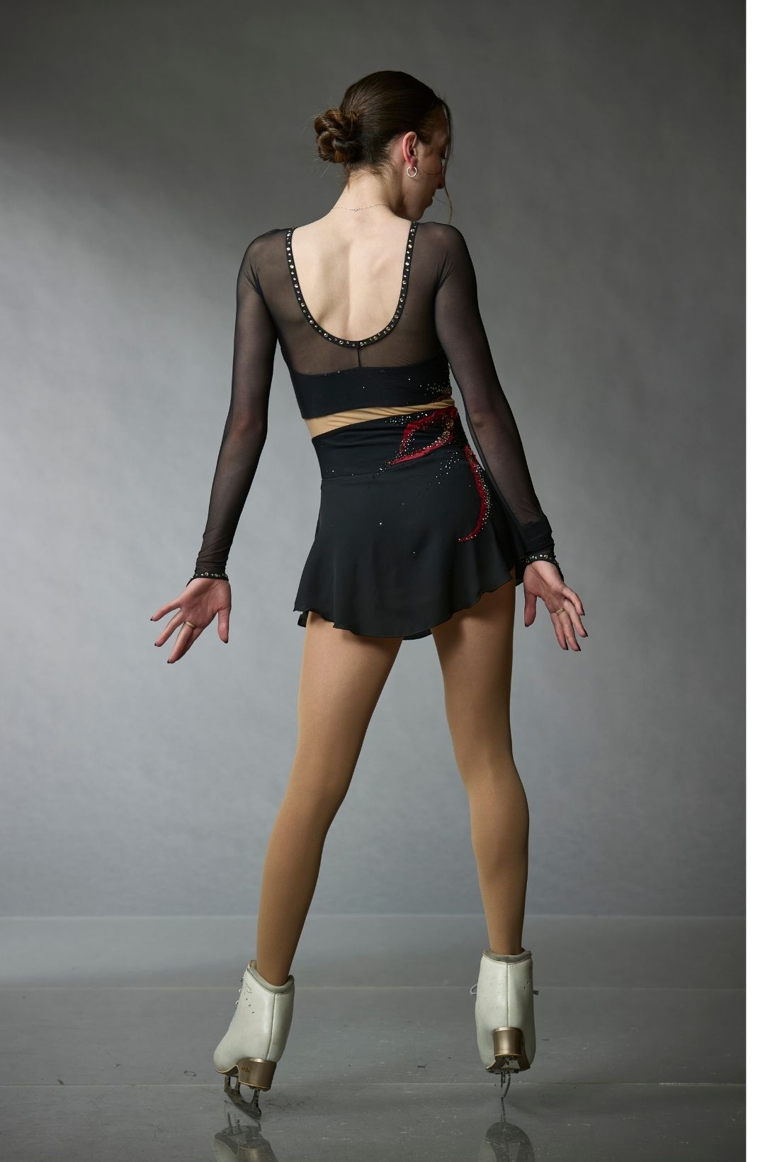 Unique skating dress from Elite Xpression's One of a Kind collection, featuring a sleek black design, sheer long sleeves, and a midriff cutout connected by subtle mesh for a unified look. Adorned with a dramatic red floral design and accented by glittering sequins and gems, this dress is perfect for a standout performance on the ice.