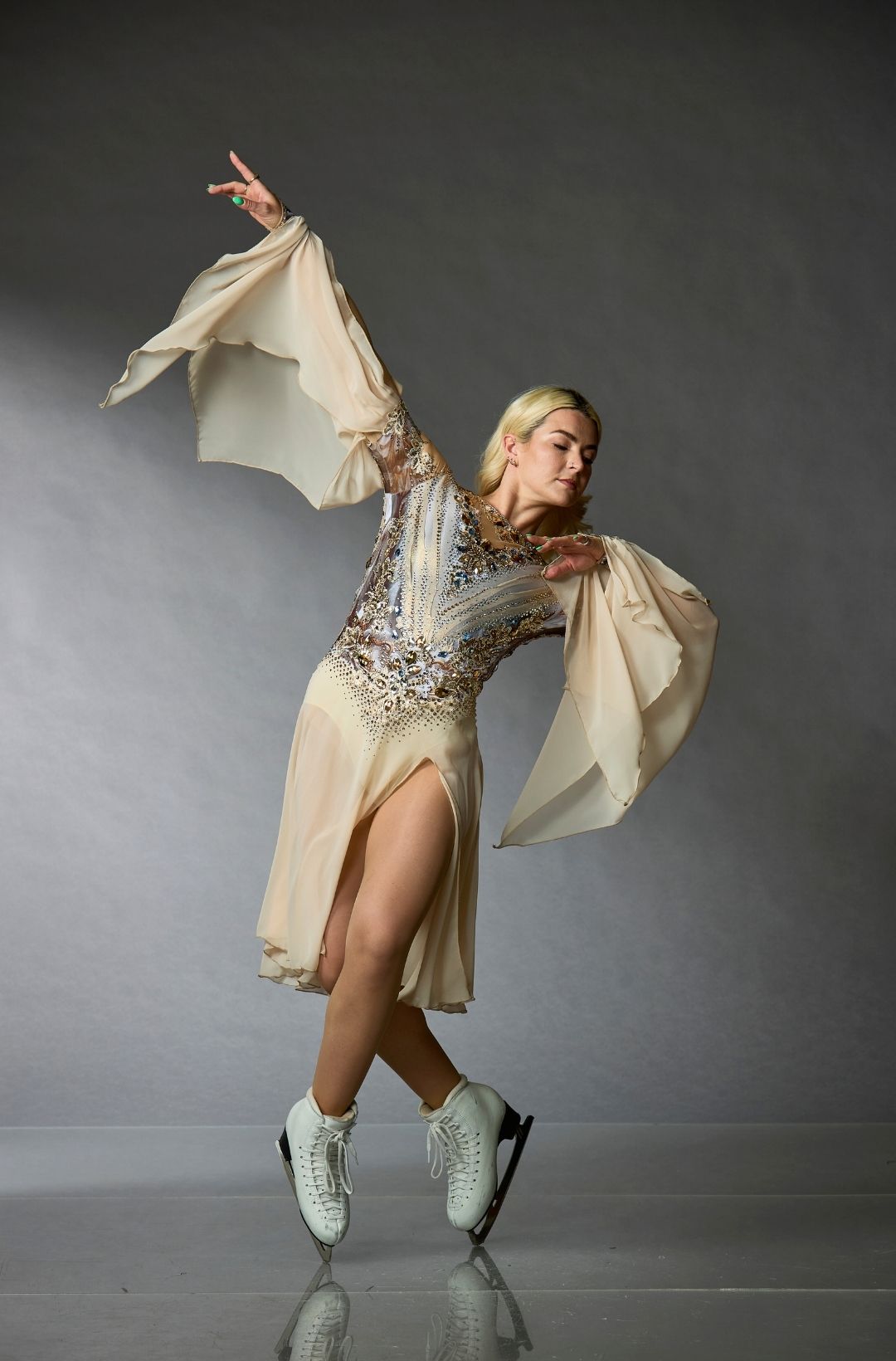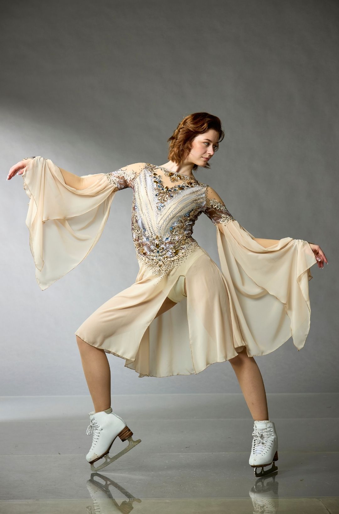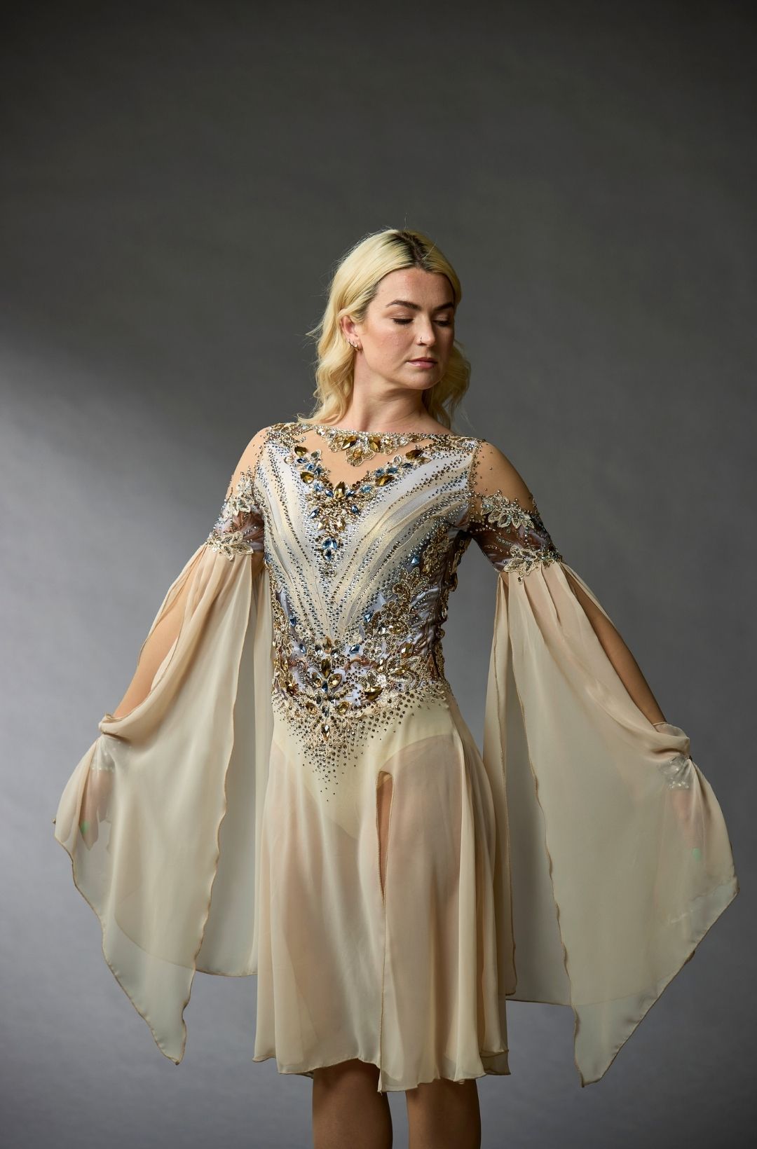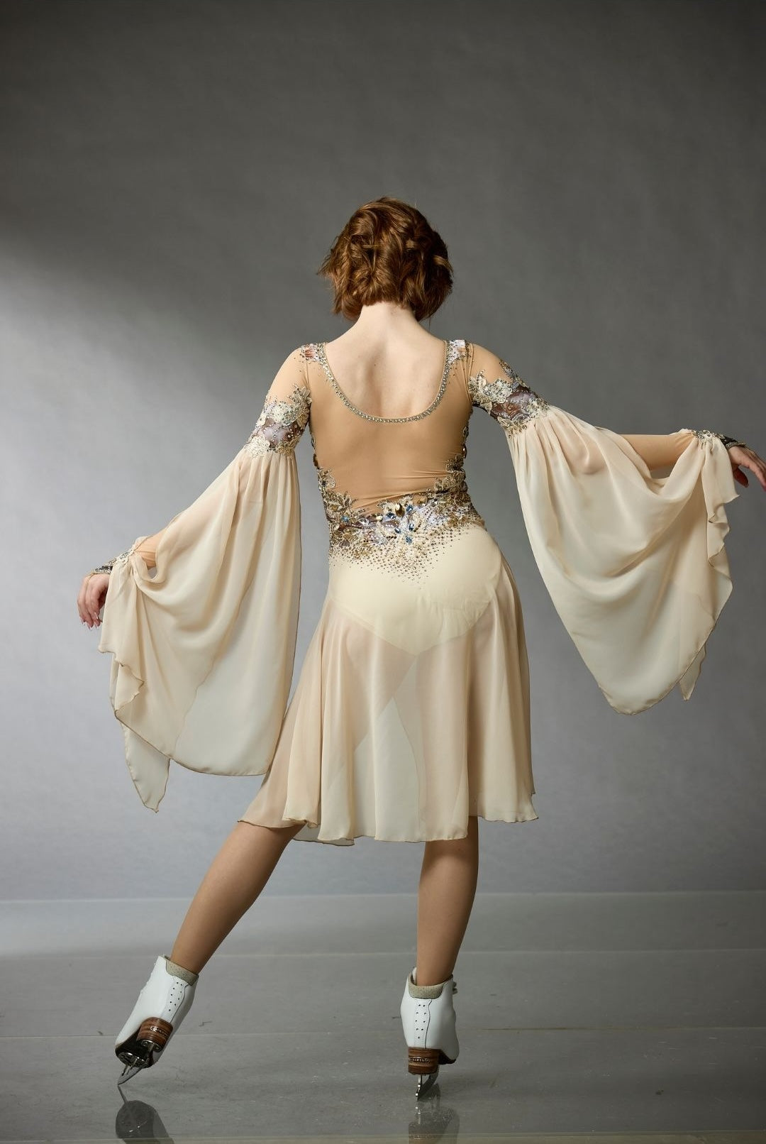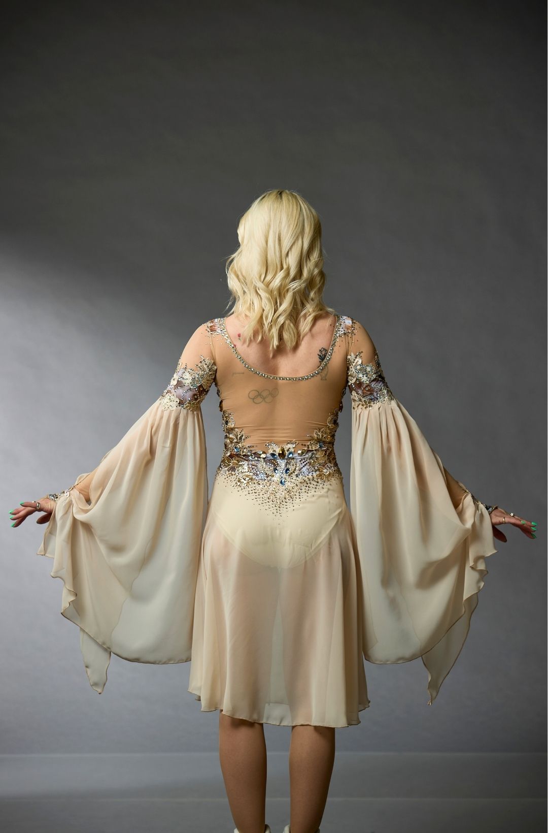 Gracieuse robe de patinage artistique champagne de la collection One of a Kind d'Elite Xpression, avec des manches longues transparentes, des applications complexes de cristal et d'or, et une jupe asymétrique légère - parfaite pour une performance élégante et expressive.