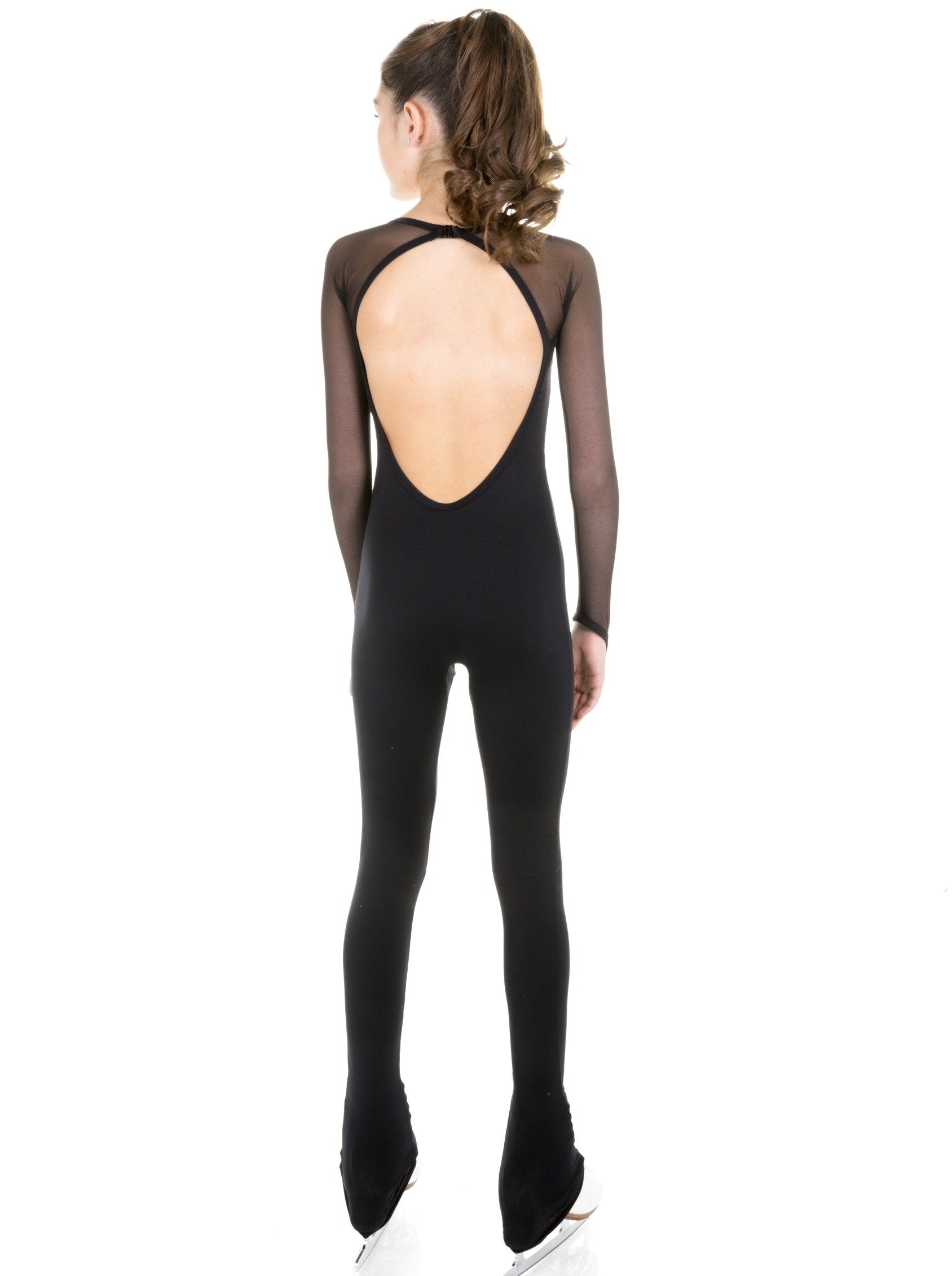Training one-piece in black Supplex with mesh long sleeves and an open back, designed for figure skating or dance by Elite Xpression.