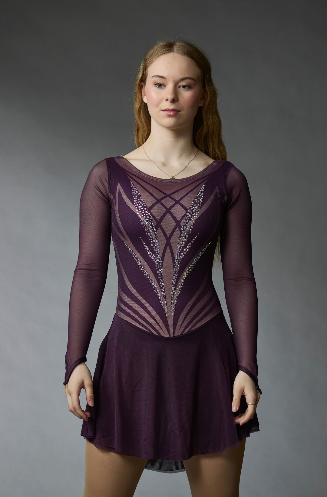 Élégante robe de patinage artistique violette à manches longues en maille et ornée de cristaux, parfaite pour une performance gracieuse. Fabriquée par Elite Xpression. Également disponible en bleu royal, noir, violet et rose.