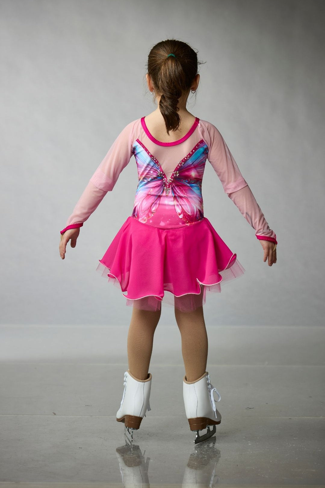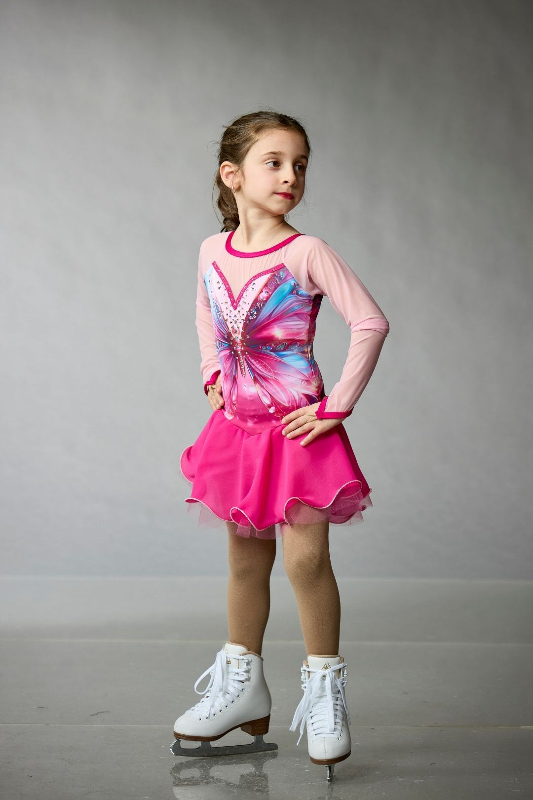 Robe de patinage artistique avec des manches longues en mèche rose pâle, un papillon imprimé dans les tons de rose décoré de cristaux, et une jupe en chiffon de multicouche et texturée par Elite Xpression.