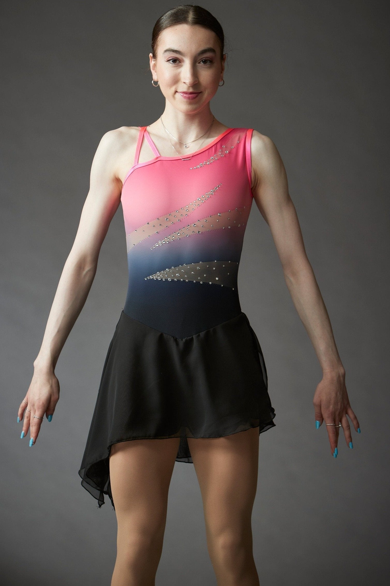 Voici une superbe robe de patinage artistique sans manches d'Elite Xpression, avec un dégradé captivant de violet vibrant à anthracite sur le corsage, orné de cristaux étincelants. Sa jupe oblongue en chiffon ajoute de l'élégance et de la grâce à chaque performance.